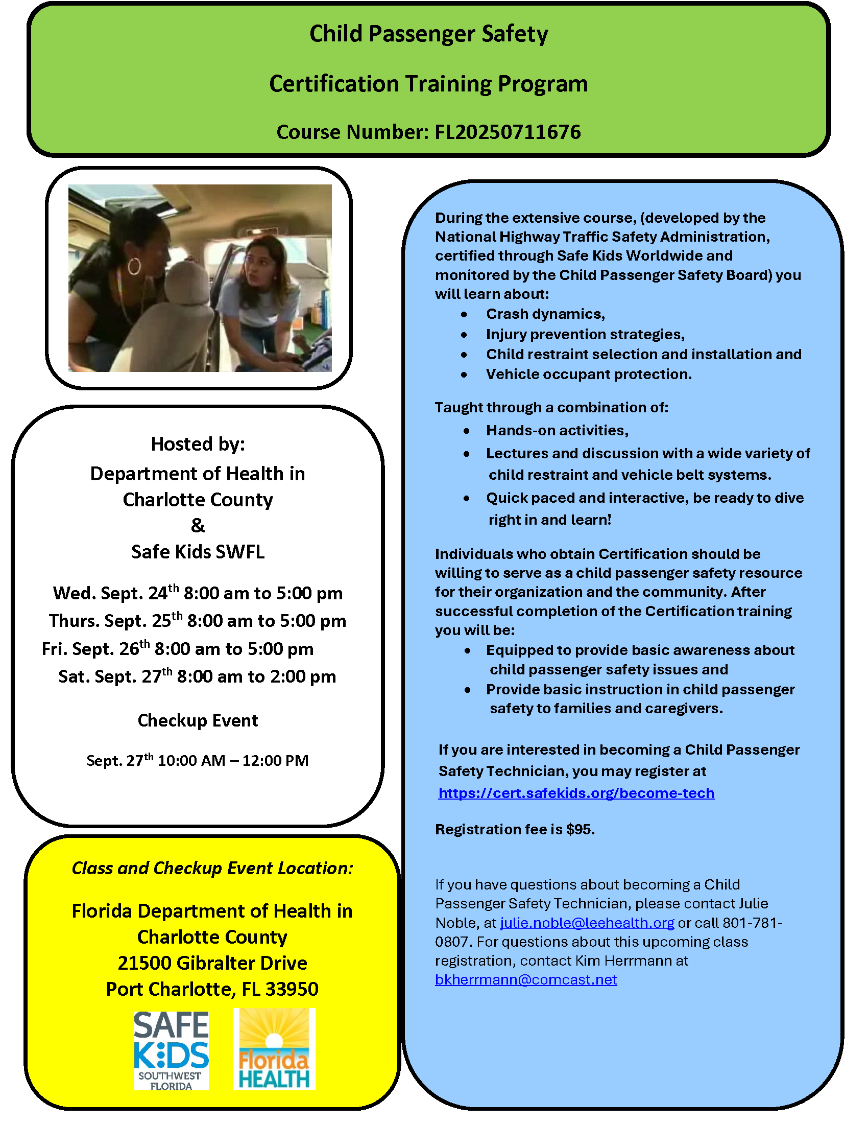 Return To Calendar Charlotte CPS Course and Seat Check Saturday Event Event Category: South Event Date: 9/24/2025 8:00 AM - 9/27/2025 5:00 PM Location: 21500 Gibralter Drive, Port Charlotte, Florida Description